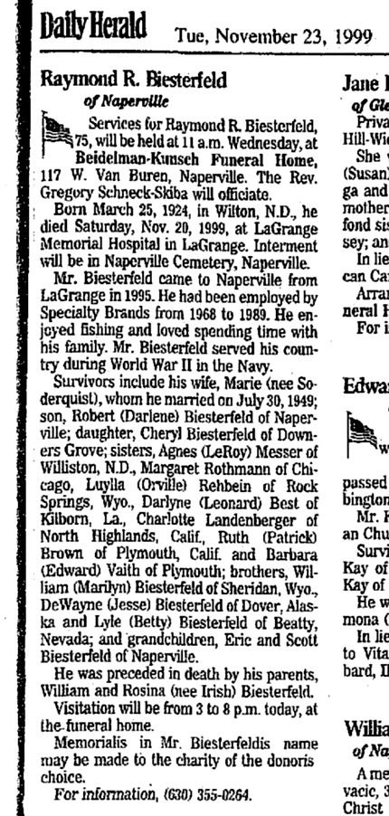 | Raymond BiesterfeldBirth: 25 Mar 1924 28 21 — Wilton, North Dakota, USA Death: 20 Nov 1999 — Chicago, Cook, Illinois, USA | | | | | | | | | | |
