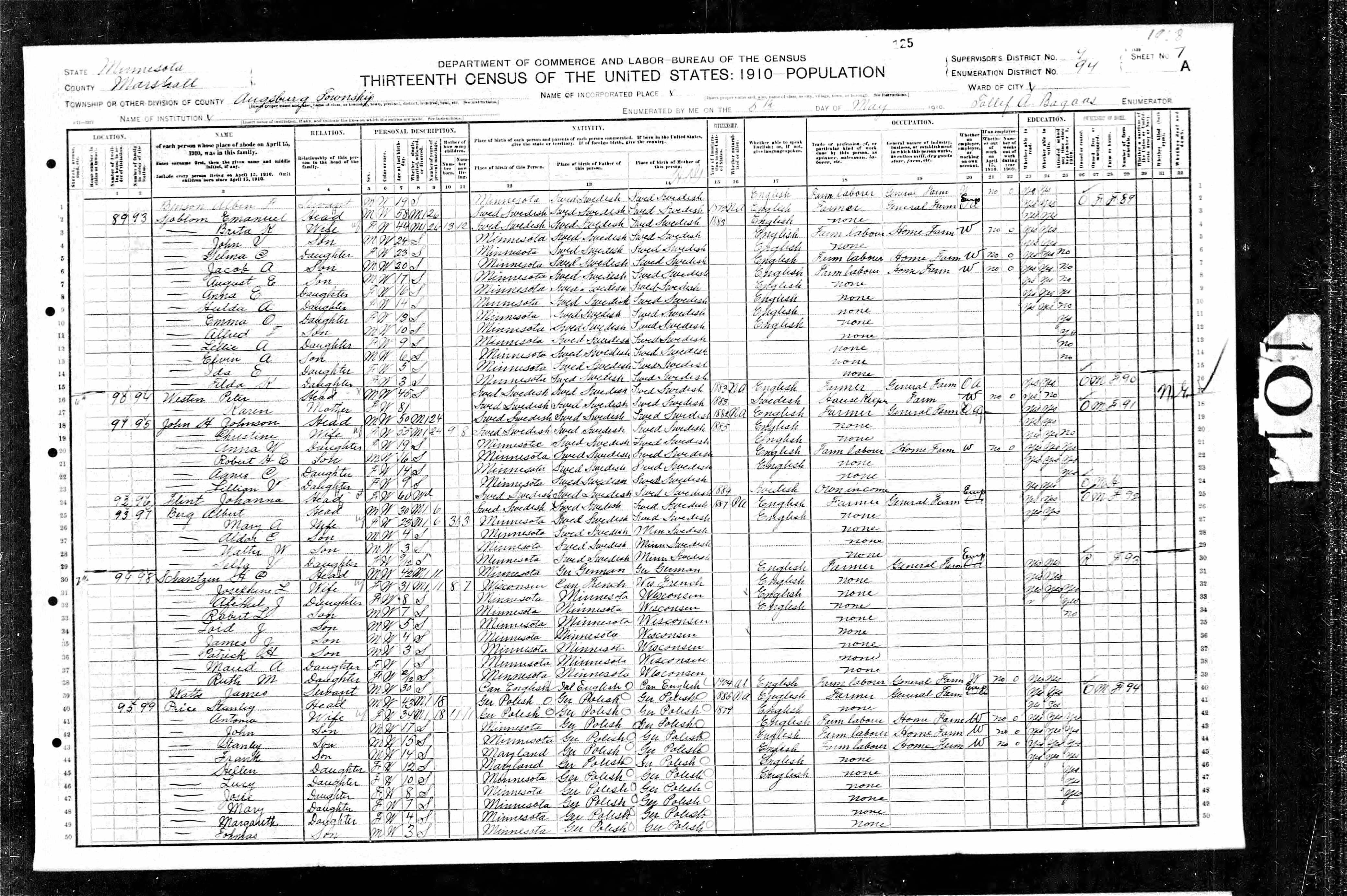 Residence place: Augsburg, Marshall, Minnesota Publication: Name: Online publication - Provo, UT, USA: Ancestry.com OperationsInc, 2010. Images reproduced by FamilySearch.Original data - Fourteenth Census of the United States, 1920. (NARA microfilm publication T625, 2076 rolls). Records of the Bureau of the Census, Reco; Citation details: Year: 1920; Census Place: Tamarac, Marshall, Minnesota; Roll:T625_844; Page: 10B; Enumeration District: 96; Image: . Text: Birth date: abt 1869