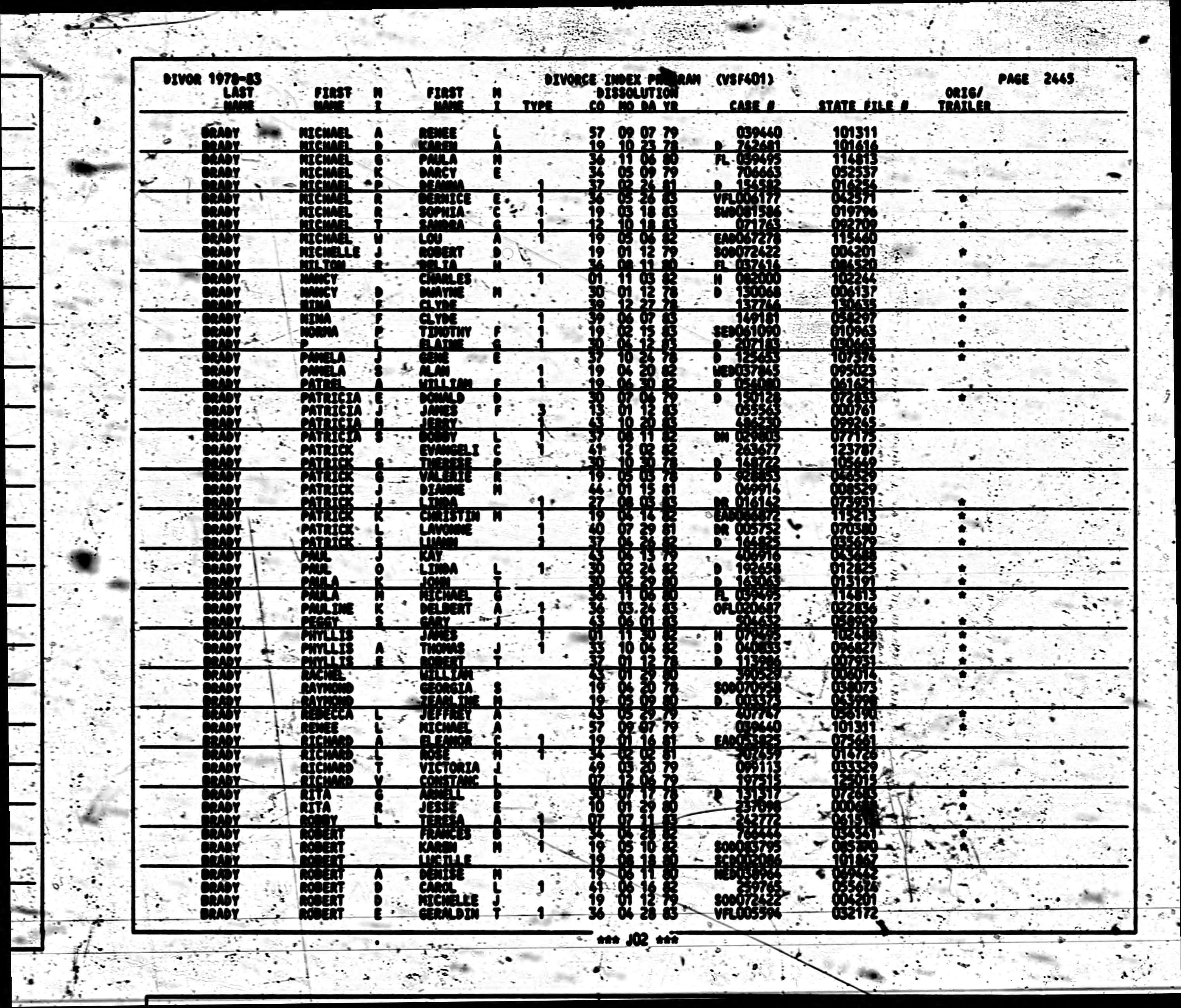 | Name | California Divorce Index, 1966-1984 Publication: Name: Online publication - Provo, UT, USA: Ancestry.com OperationsInc, 2007.Original data - State of California. California Divorce Index, 1966-1984. Microfiche. Center for Health Statistics, California Department of Health Services, Sacramento, California.Orig; Text: Divorce date: 12 Apr 1983