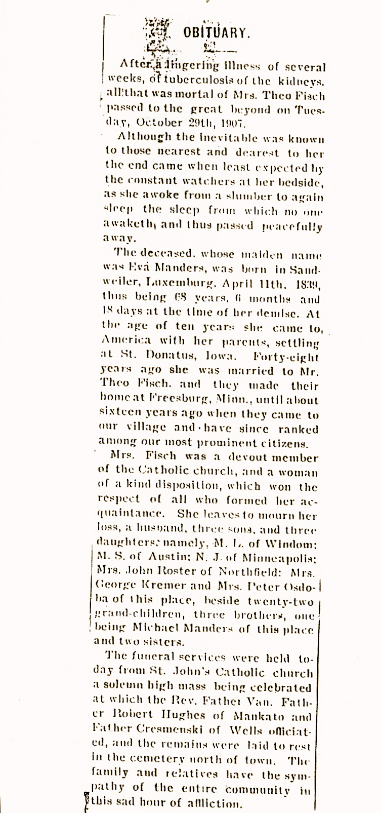 Birth: 11 Apr 1839 — Sandweiler, Luxembourg, Luxembourg Death: 29 Oct 1907 — Minnesota Lake, Faribault, Minnesota, United States |