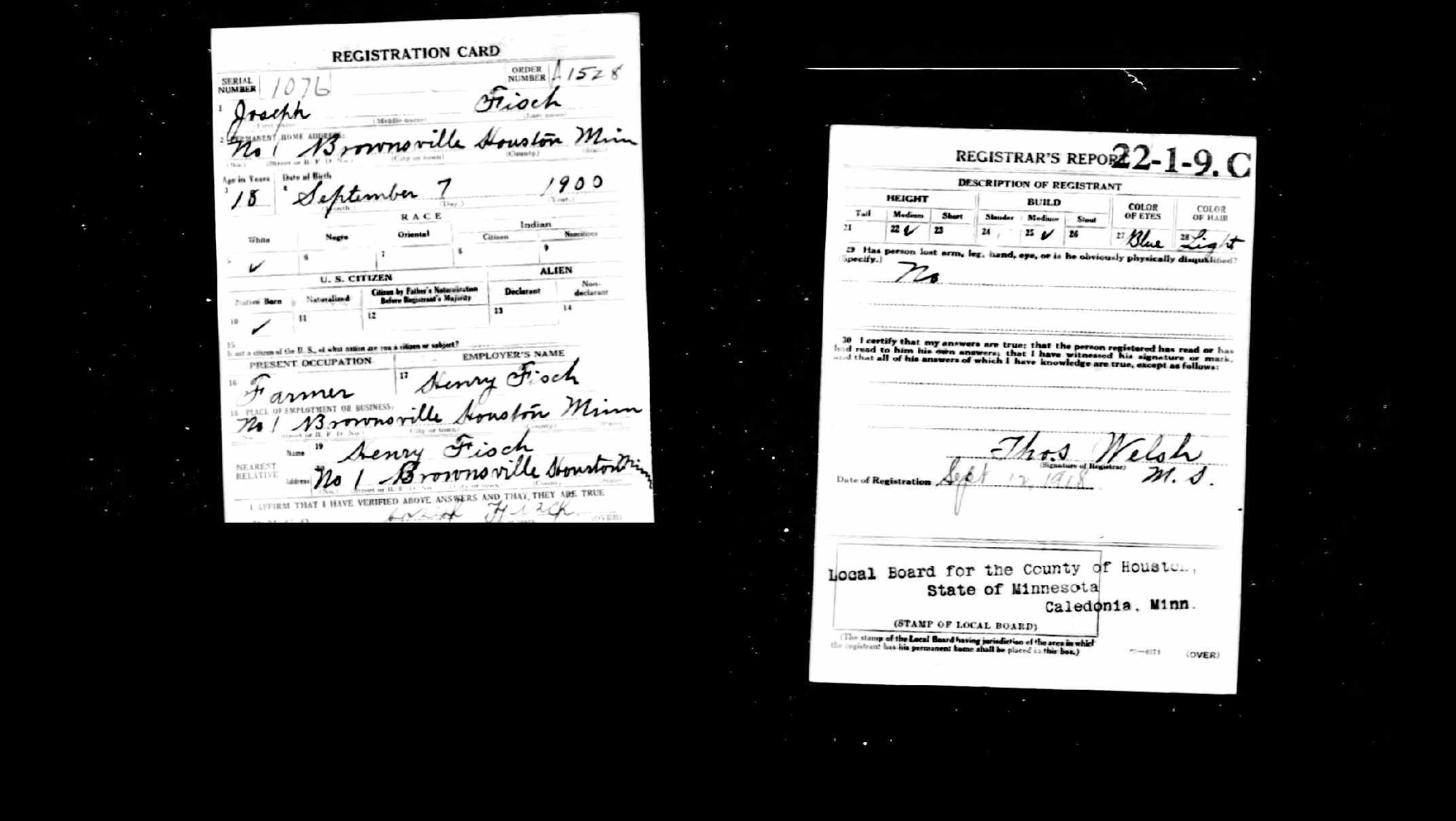 Citation details: Registration Location: Houston County, Minnesota; Roll: 1675470; DraftBoard: 0.