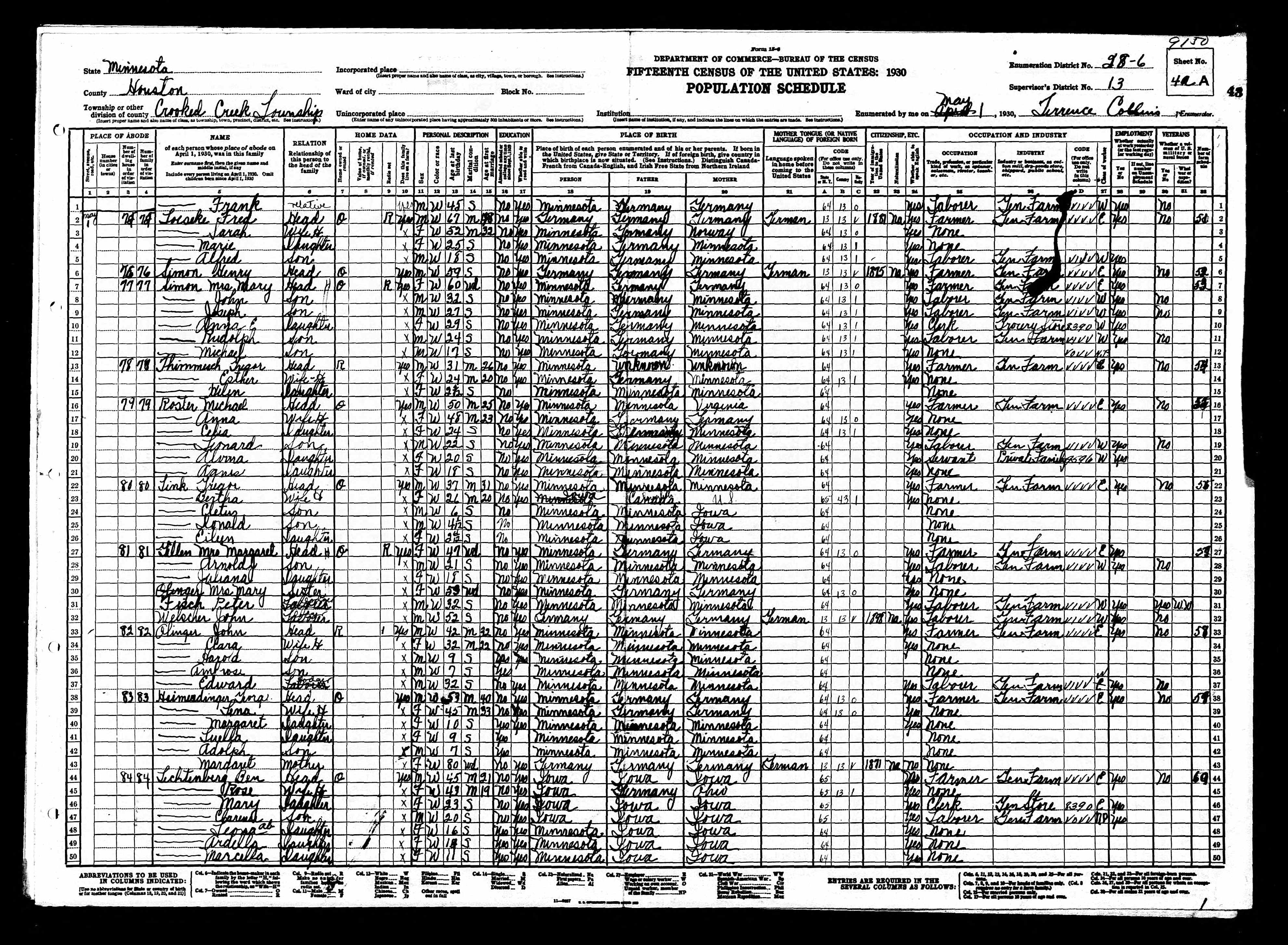 Citation details: Year: 1930; Census Place: Caledonia, Houston, Minnesota; Roll: ; Page:; Enumeration District: ; Image: .