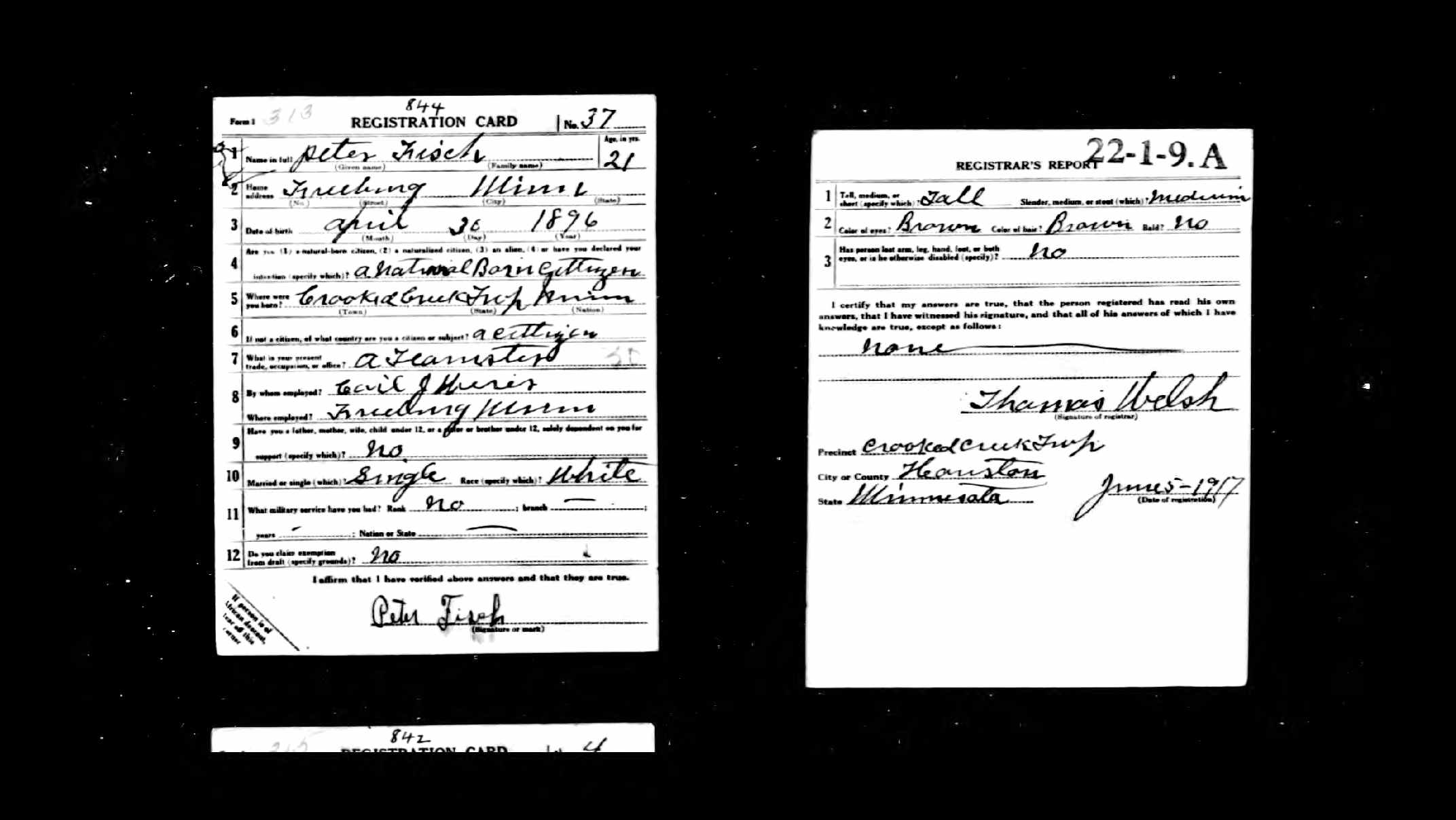 | Residence | World War I Draft Registration Cards, 1917-1918 Publication: Name: Online publication - Provo, UT, USA: Ancestry.com OperationsInc, 2005.Original data - United States, Selective Service System. World War I Selective Service System Draft Registration Cards, 1917-1918. Washington, D.C.: National Archives and Records Admini; Citation details: Registration Location: Houston County, Minnesota; Roll: 1675470; DraftBoard: 0. Text: Birth date: 30 Apr 1896