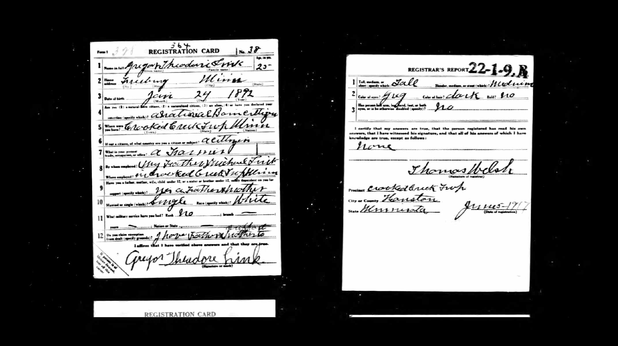 Residence place: Crooked Creek township, Houston, Minnesota Publication: Name: Online publication - Provo, UT, USA: Ancestry.com OperationsInc, 2005.Original data - United States, Selective Service System. World War I Selective Service System Draft Registration Cards, 1917-1918. Washington, D.C.: National Archives and Records Admini; Citation details: Registration Location: Houston County, Minnesota; Roll: 1675470; DraftBoard: 0. Text: Birth date: 24 Jan 1892
