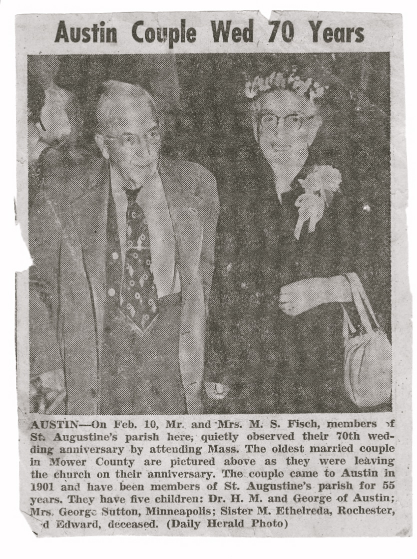 | Death of a son | Edward Nicholas Fisch 14 Oct 1933 (Age 71 years) Source: Minnesota Death Index, 1908-2002 Publication: Name: Online publication - Provo, UT, USA: Ancestry.com OperationsInc, 2001.Original data - State of Minnesota. Minnesota Death Index, 1908-1002. Minneapolis, MN, USA: Minnesota Department of Health.Original data: State of Minnesota. Minnesota Death Index, 1908; Text: Death date: 14 Oct 1933