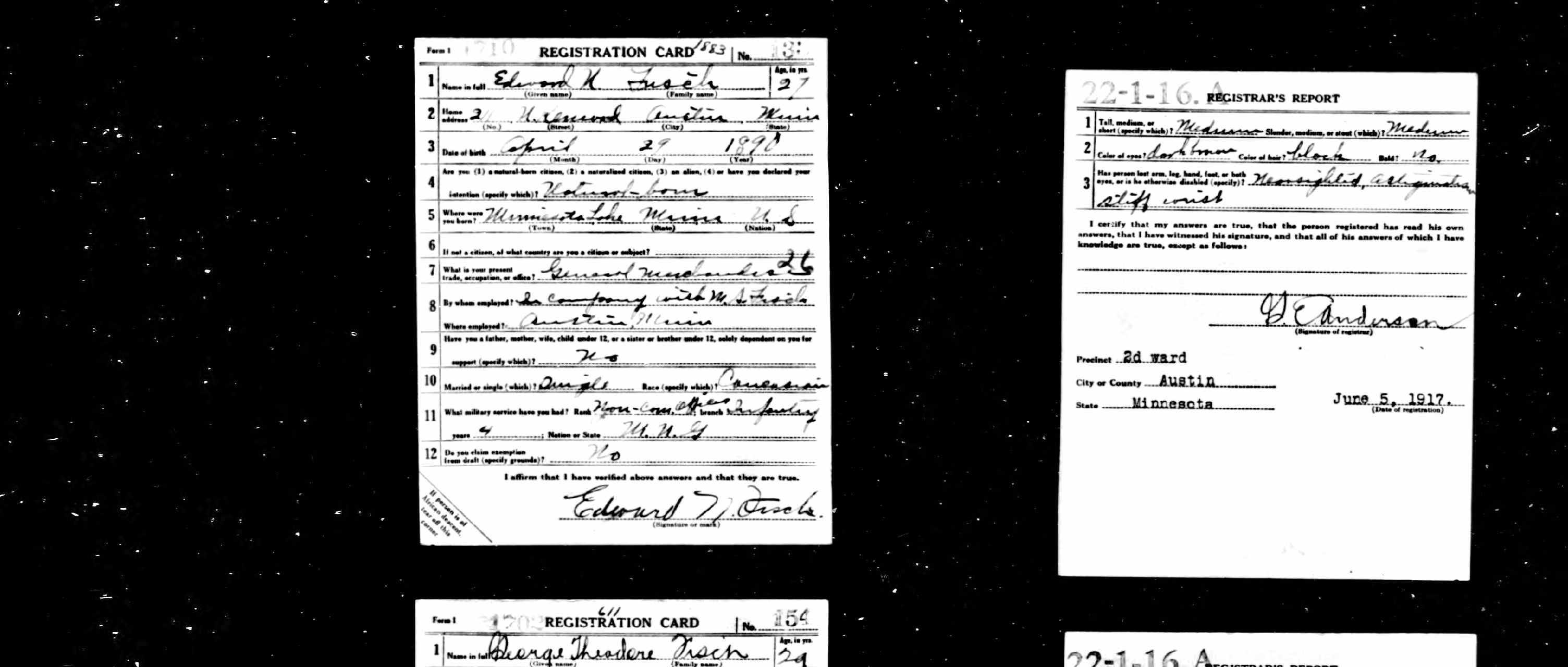 Residence place: Austin, Mower, Minnesota Publication: Name: Online publication - Provo, UT, USA: Ancestry.com OperationsInc, 2005.Original data - United States, Selective Service System. World War I Selective Service System Draft Registration Cards, 1917-1918. Washington, D.C.: National Archives and Records Admini; Citation details: Registration Location: Mower County, Minnesota; Roll: 1675687; DraftBoard: 0. Text: Birth date: 13 Jun 1888