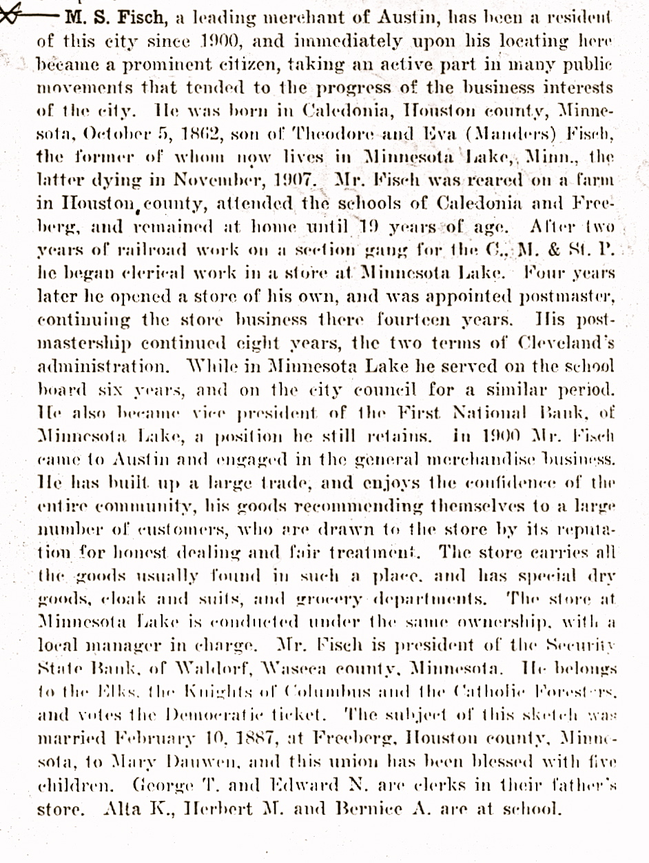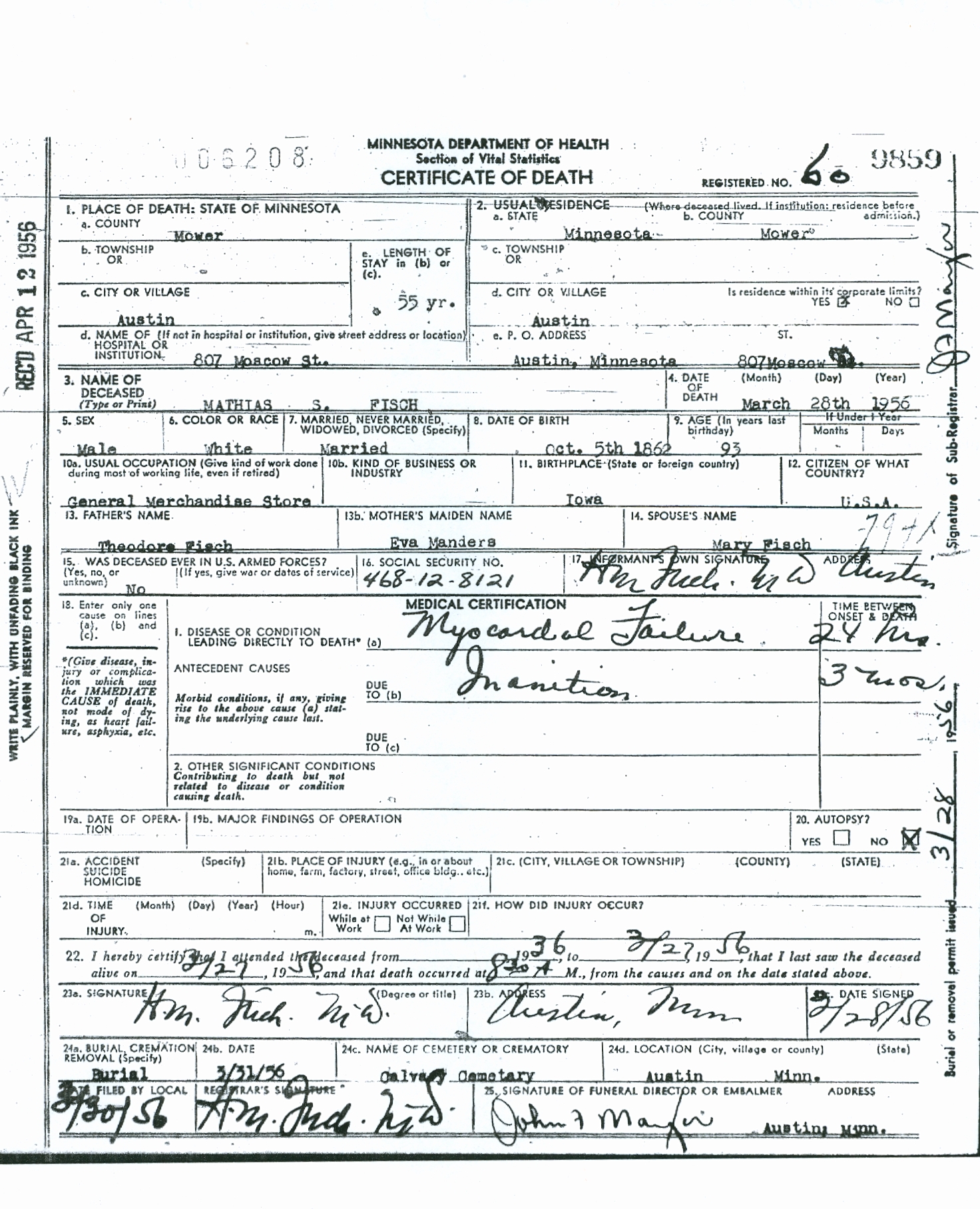 | Death of a father | Theodore Fisch 04 Jan 1911 (Age 48 years) Source: Minnesota Death Index, 1908-2002 Publication: Name: Online publication - Provo, UT, USA: Ancestry.com OperationsInc, 2001.Original data - State of Minnesota. Minnesota Death Index, 1908-1002. Minneapolis, MN, USA: Minnesota Department of Health.Original data: State of Minnesota. Minnesota Death Index, 1908; Text: Death date: 4 Jan 1911