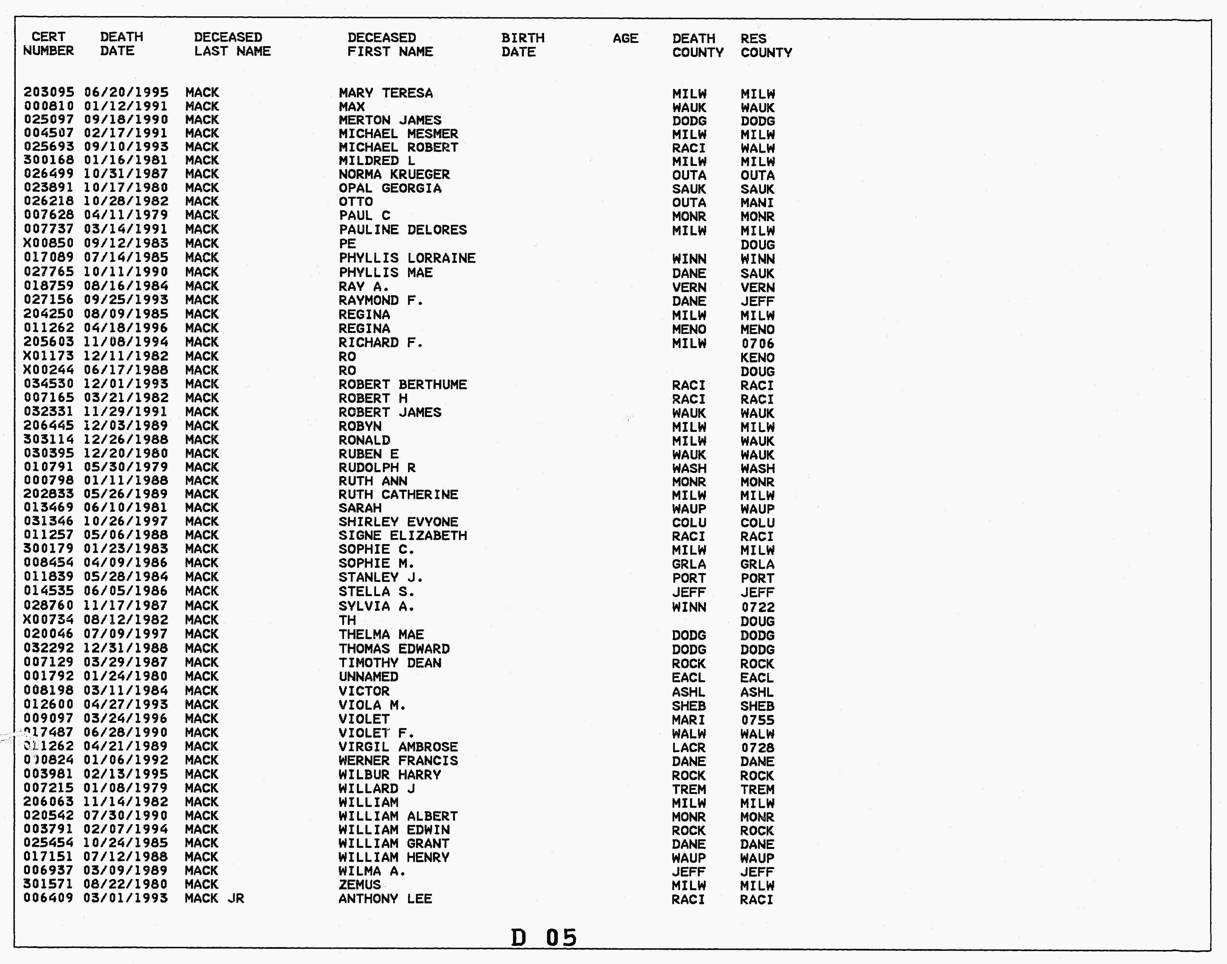 Publication: Name: Online publication - Provo, UT, USA: Ancestry.com OperationsInc, 2007.Original data - Wisconsin Vital Records Office. Wisconsin Death Index, 1959-67, 1969-97. Madison, Wisconsin, USA: Wisconsin Department of Health.Original data: Wisconsin Vital Records O;