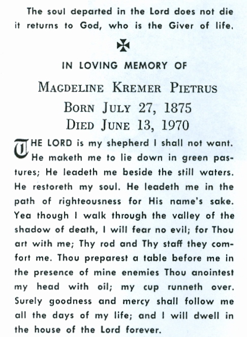 | Death of a son | Robert Kremer May 1969 (Age 93 years) Source: Social Security Death Index Publication: Name: Online publication - Provo, UT, USA: Ancestry.com OperationsInc, 2011.Original data - Social Security Administration. Social Security Death Index, Master File. Social Security Administration.Original data: Social Security Administration. Social Security D; Citation details: Number: 471-01-7156; Issue State: Minnesota; Issue Date: Before 1951. Text: Birth date: 24 Sep 1909