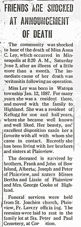 | Death of a sister | Anna C. Ley 03 Jun 1916 (Age 36 years) Source: Minnesota Death Index, 1908-2002 Publication: Name: Online publication - Provo, UT, USA: Ancestry.com OperationsInc, 2001.Original data - State of Minnesota. Minnesota Death Index, 1908-1002. Minneapolis, MN, USA: Minnesota Department of Health.Original data: State of Minnesota. Minnesota Death Index, 1908; Text: Death date: 3 Jun 1916