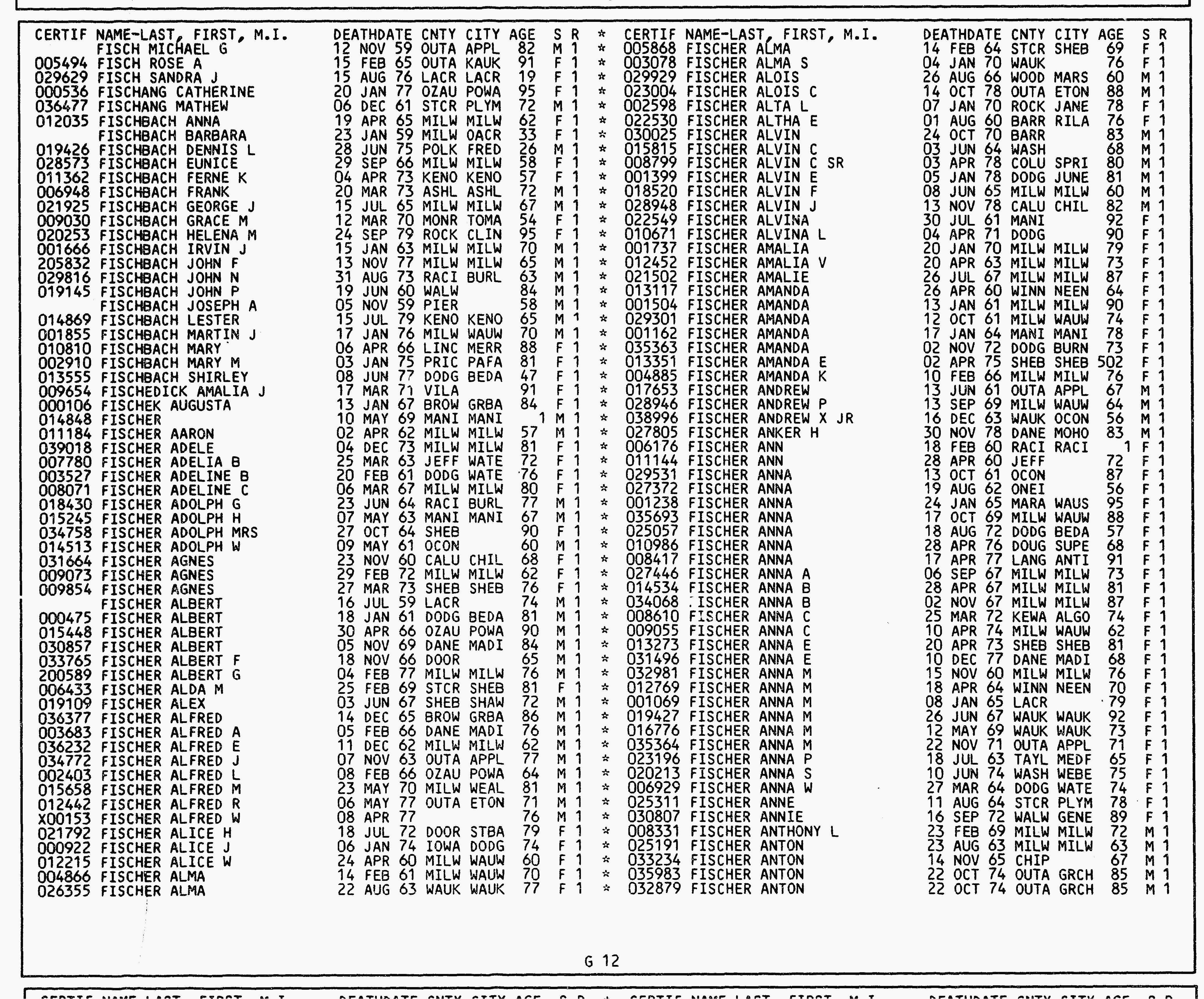 | Name | Wisconsin Death Index, 1959-1997 Publication: Name: Online publication - Provo, UT, USA: Ancestry.com OperationsInc, 2007.Original data - Wisconsin Vital Records Office. Wisconsin Death Index, 1959-67, 1969-97. Madison, Wisconsin, USA: Wisconsin Department of Health.Original data: Wisconsin Vital Records O; Text: Birth date: abt 1957