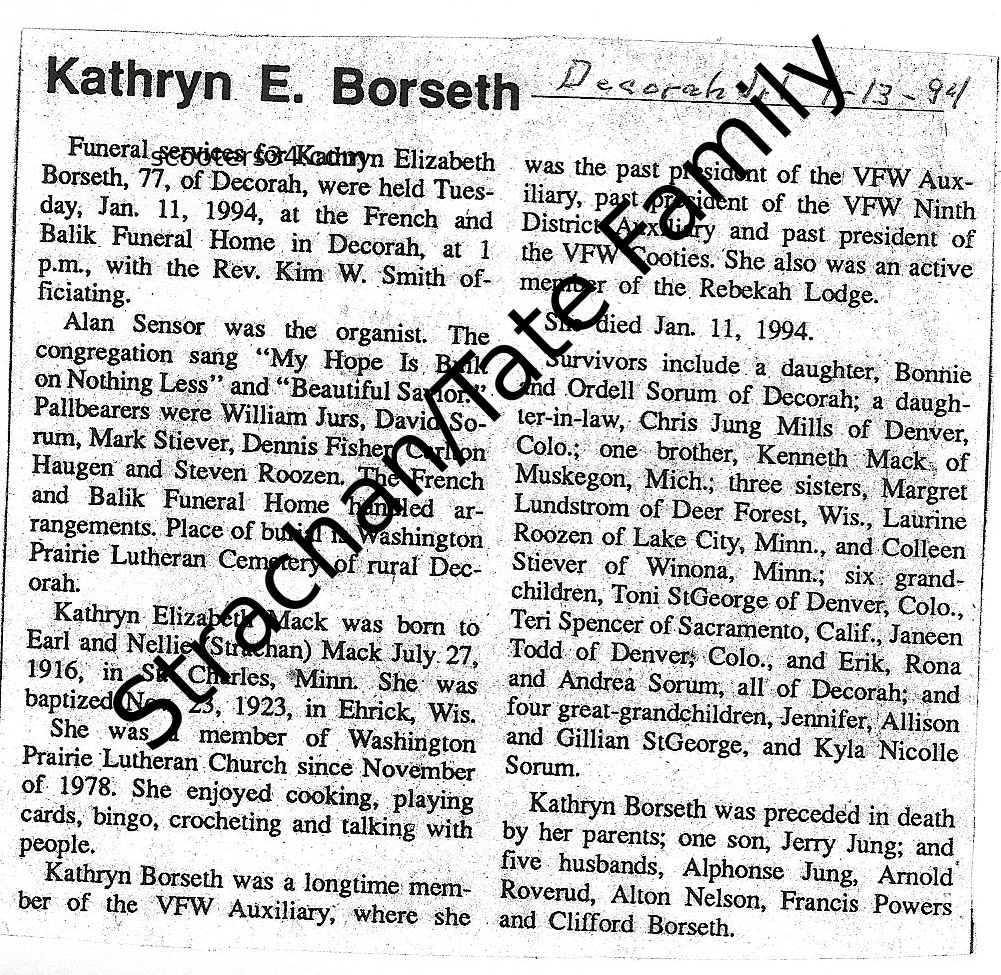 | Marriage of a sibling | Clifford Edward Borseth — Kathryn Elizabeth 'Katie' Mack — View this family 24 May 1980 (Age 59 years) Address: Washington Prairie Lutheran Church |
