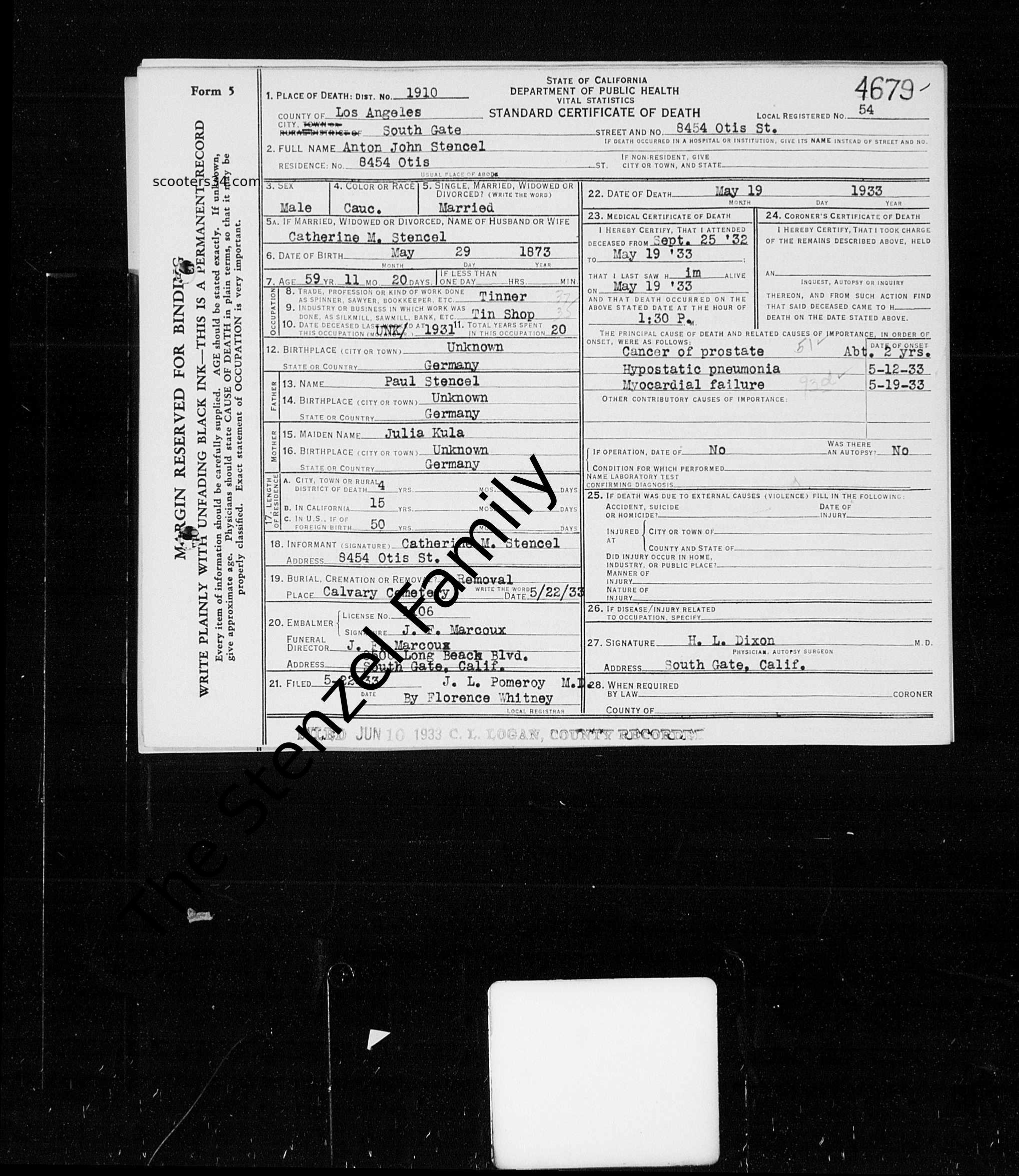 | Death of a father | Anton Joseph Stenzel 19 May 1933 – 1:30 PM PDT (Age 17 years) Cause: Myocardial failure, Hypostatic pneumonia Source: California Death Certificate |
