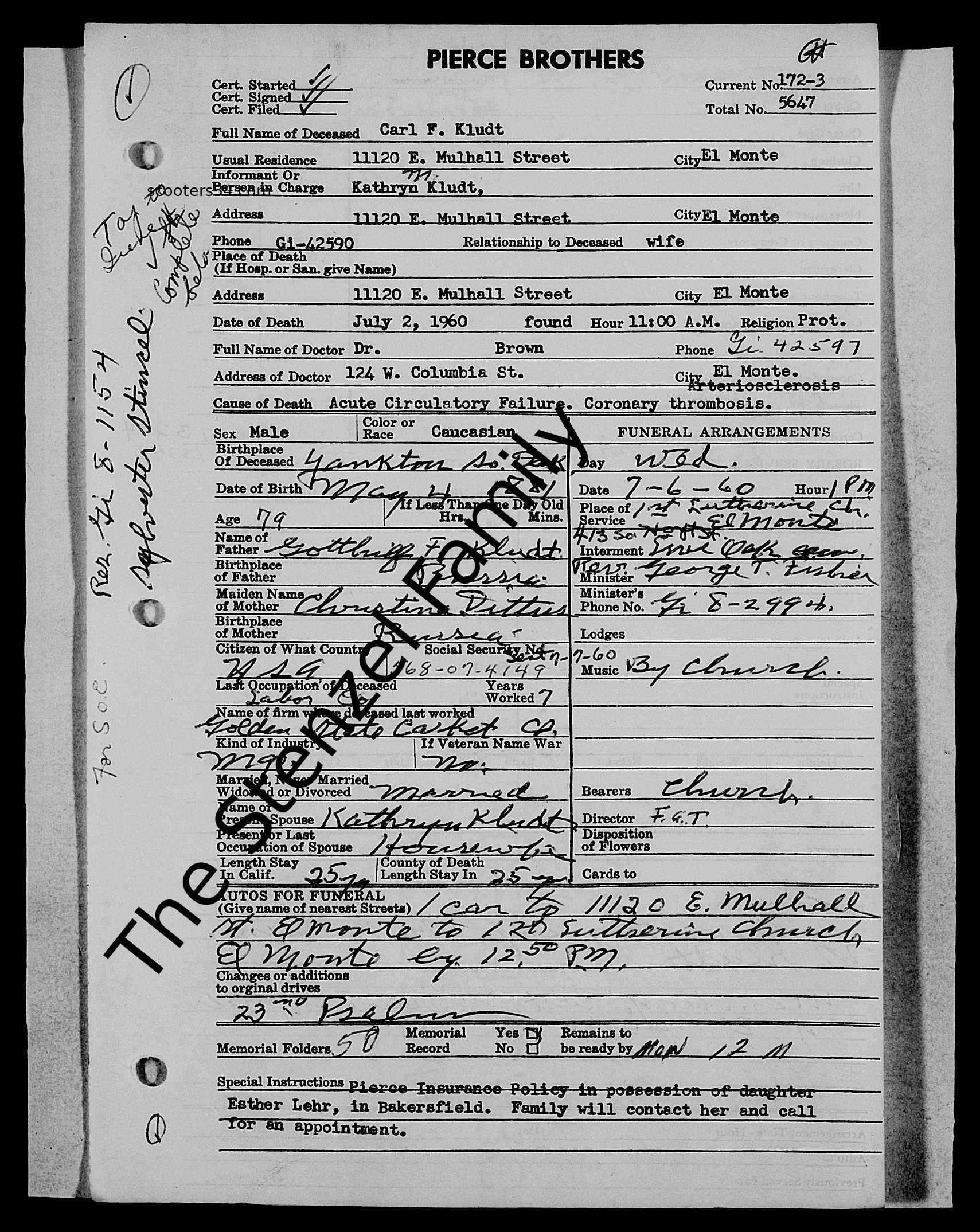 Carl Friedrich Kludt Birth: 05 Apr 1881 — Yankton. Yankton, South Dakota, USA Death: 02 Jul 1960 — El Monte, Los Angeles, California, USA |