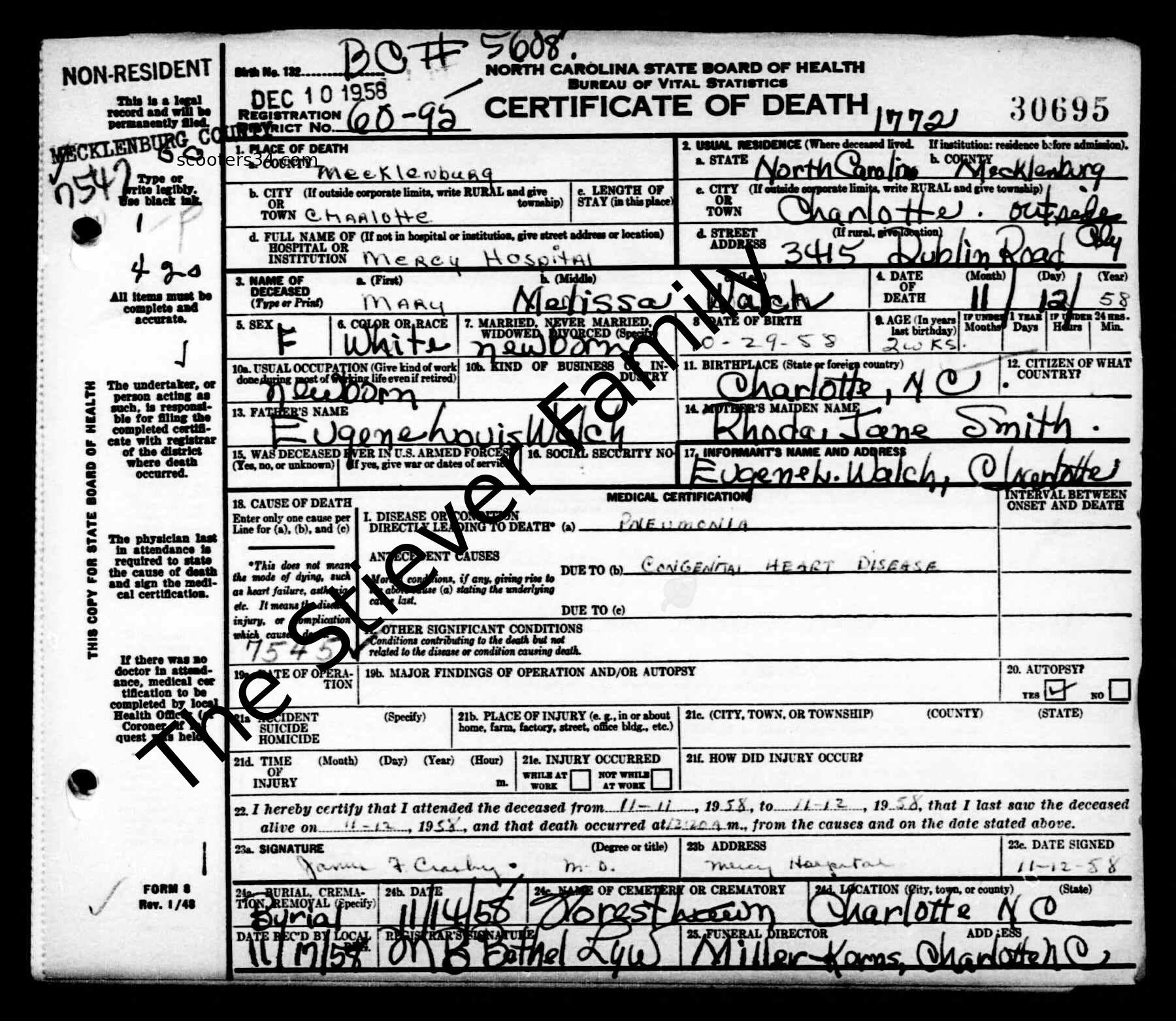 Mary Melissa Walch Birth: 29 Oct 1958 — Charlotte, Mecklenburg, North Carolina, USA Death: 12 Nov 1958 — Charlotte, Mecklenburg, North Carolina, USA |