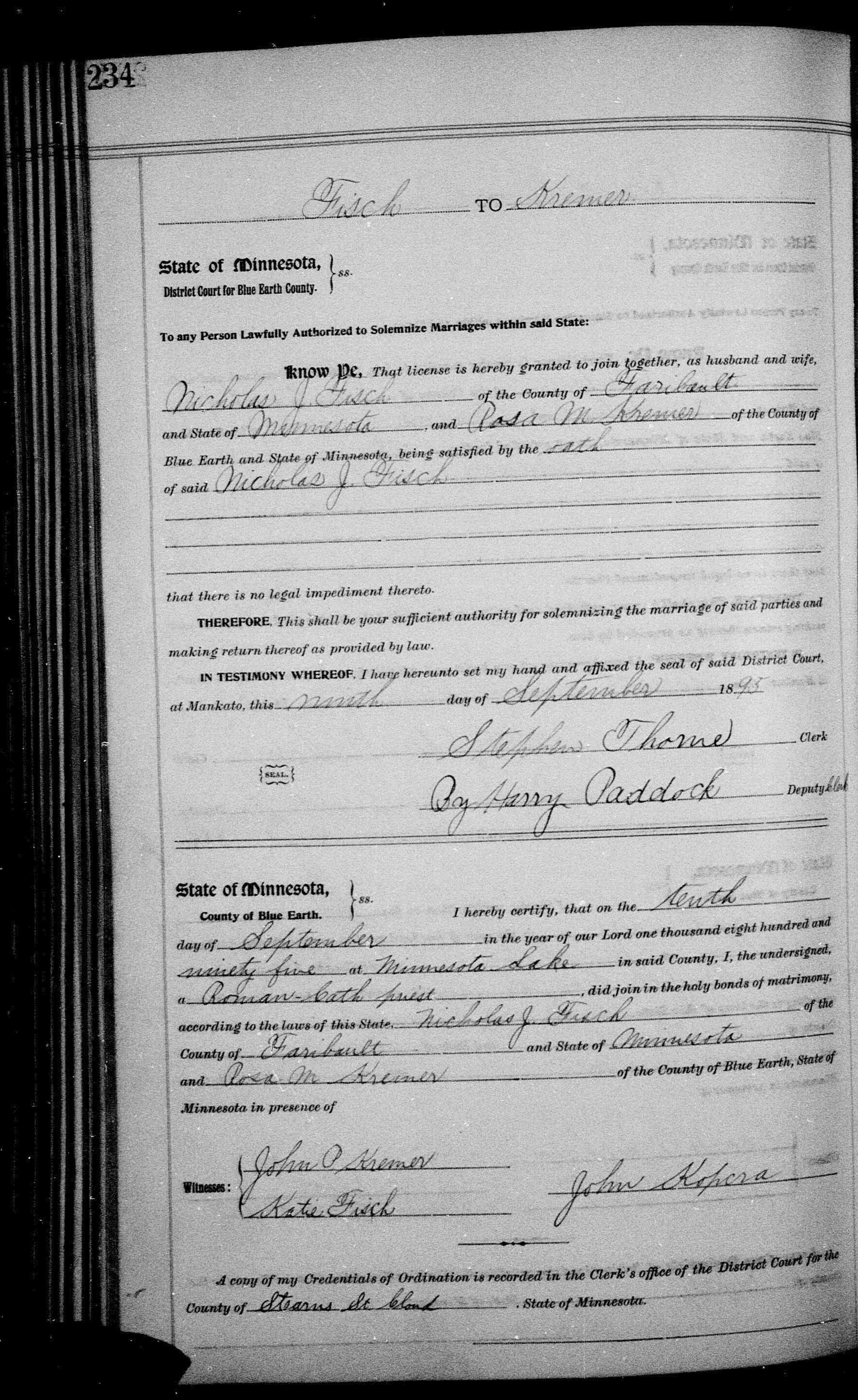 Marriage record for Nicholas J and Rose Kremer