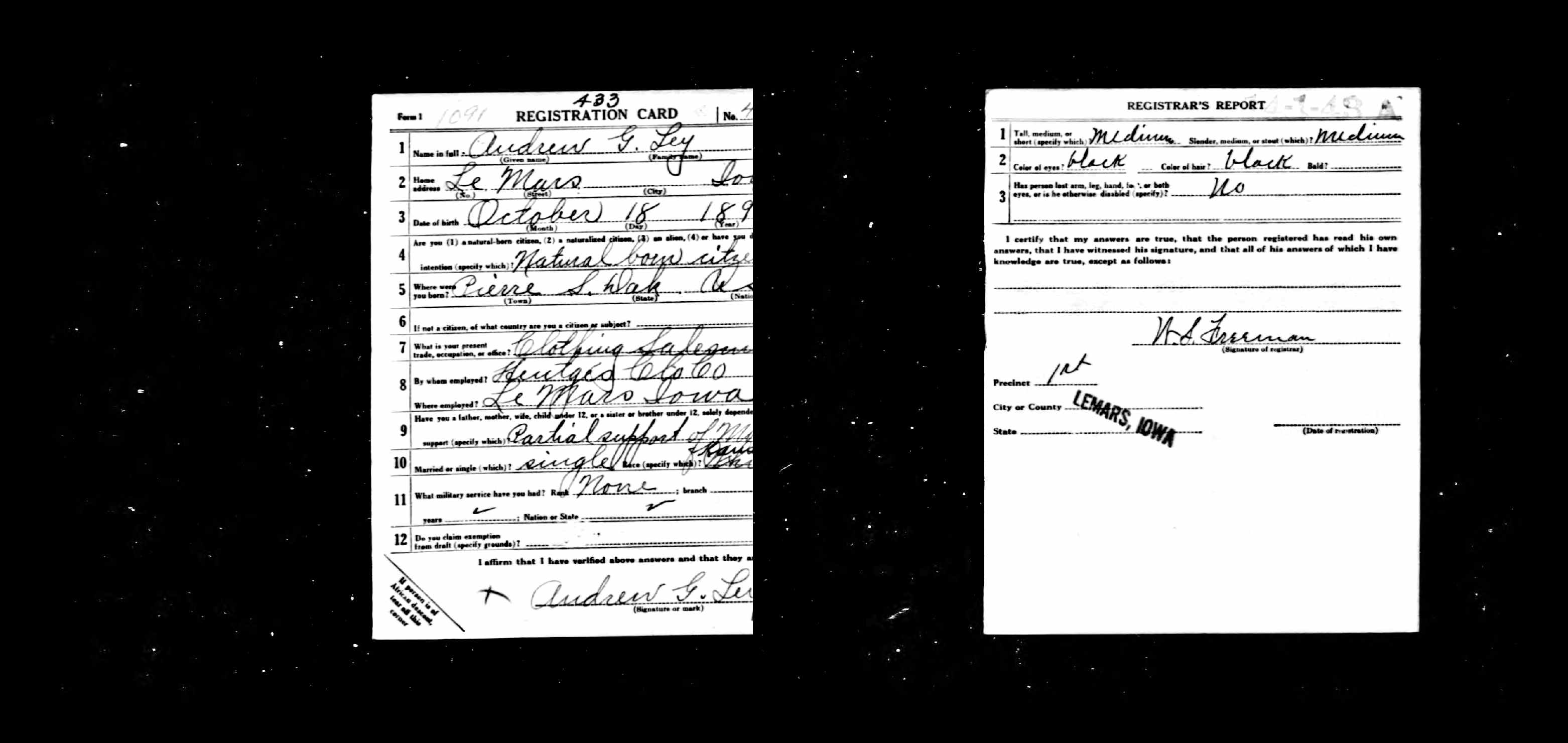 Residence place: Carroll, Carroll, Iowa Publication: Name: Online publication - Provo, UT, USA: Ancestry.com OperationsInc, 2005.Original data - United States, Selective Service System. World War I Selective Service System Draft Registration Cards, 1917-1918. Washington, D.C.: National Archives and Records Admini; Citation details: Registration Location: Plymouth County, Iowa; Roll: 1643219; DraftBoard: 0. Text: Birth date: 18 Oct 1893
