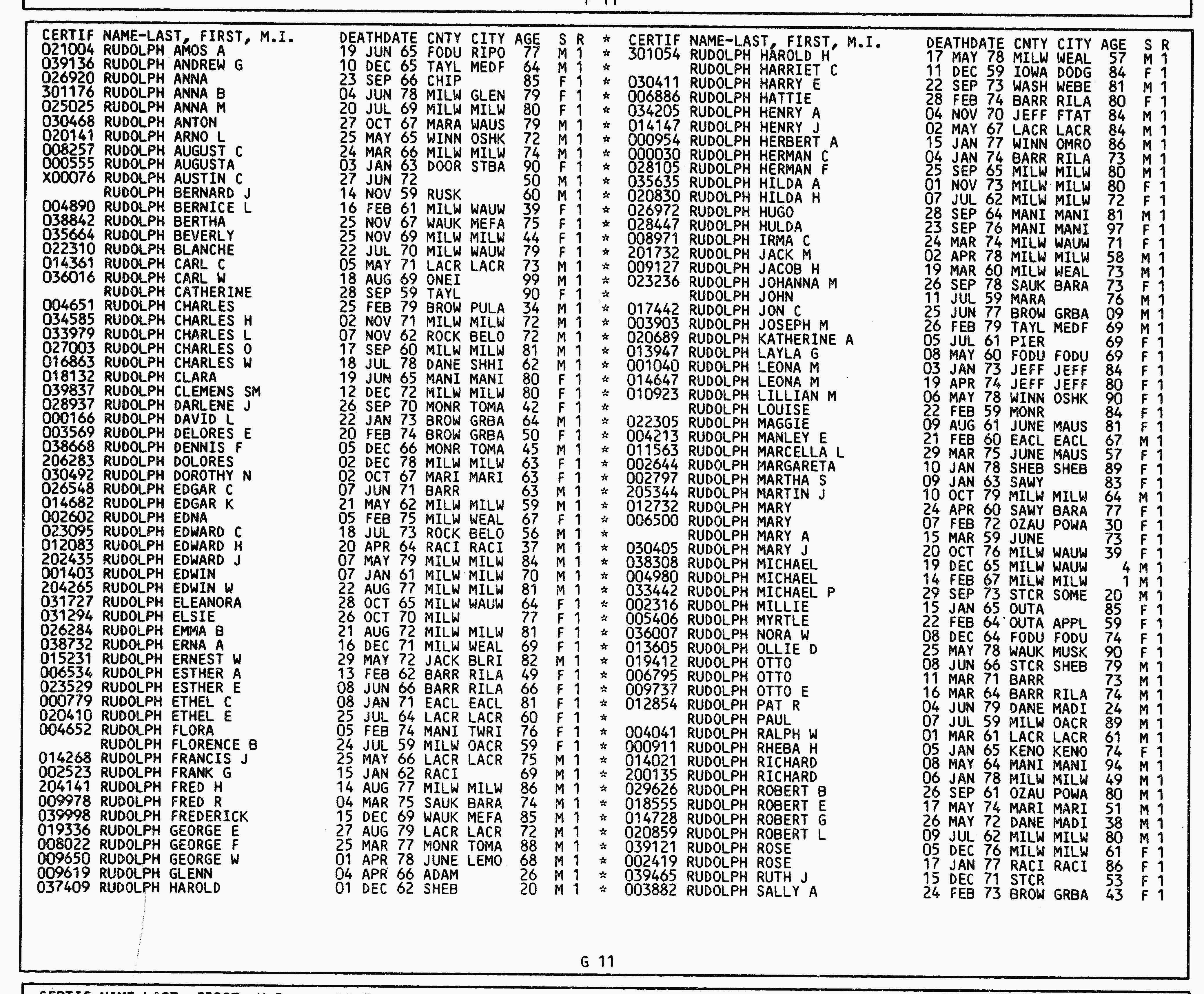| Death of a father | Henry J Rudolph 02 May 1967 (Age 48 years) Source: Wisconsin Death Index, 1959-1997 Publication: Name: Online publication - Provo, UT, USA: Ancestry.com OperationsInc, 2007.Original data - Wisconsin Vital Records Office. Wisconsin Death Index, 1959-67, 1969-97. Madison, Wisconsin, USA: Wisconsin Department of Health.Original data: Wisconsin Vital Records O; Text: Birth date: abt 1883